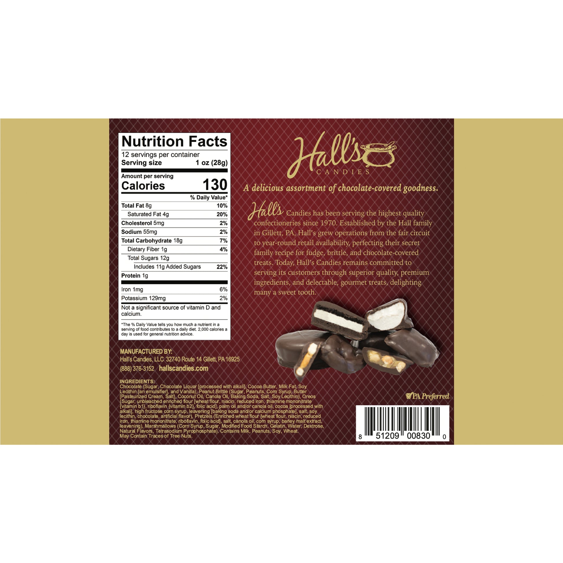 You won't want to miss this! Our 12-ounce assortment of luscious, chocolate-covered treats is rich and delicious. It includes hand-dipped dark chocolate-covered peanut brittle, Oreos, marshmallows, and pretzels.