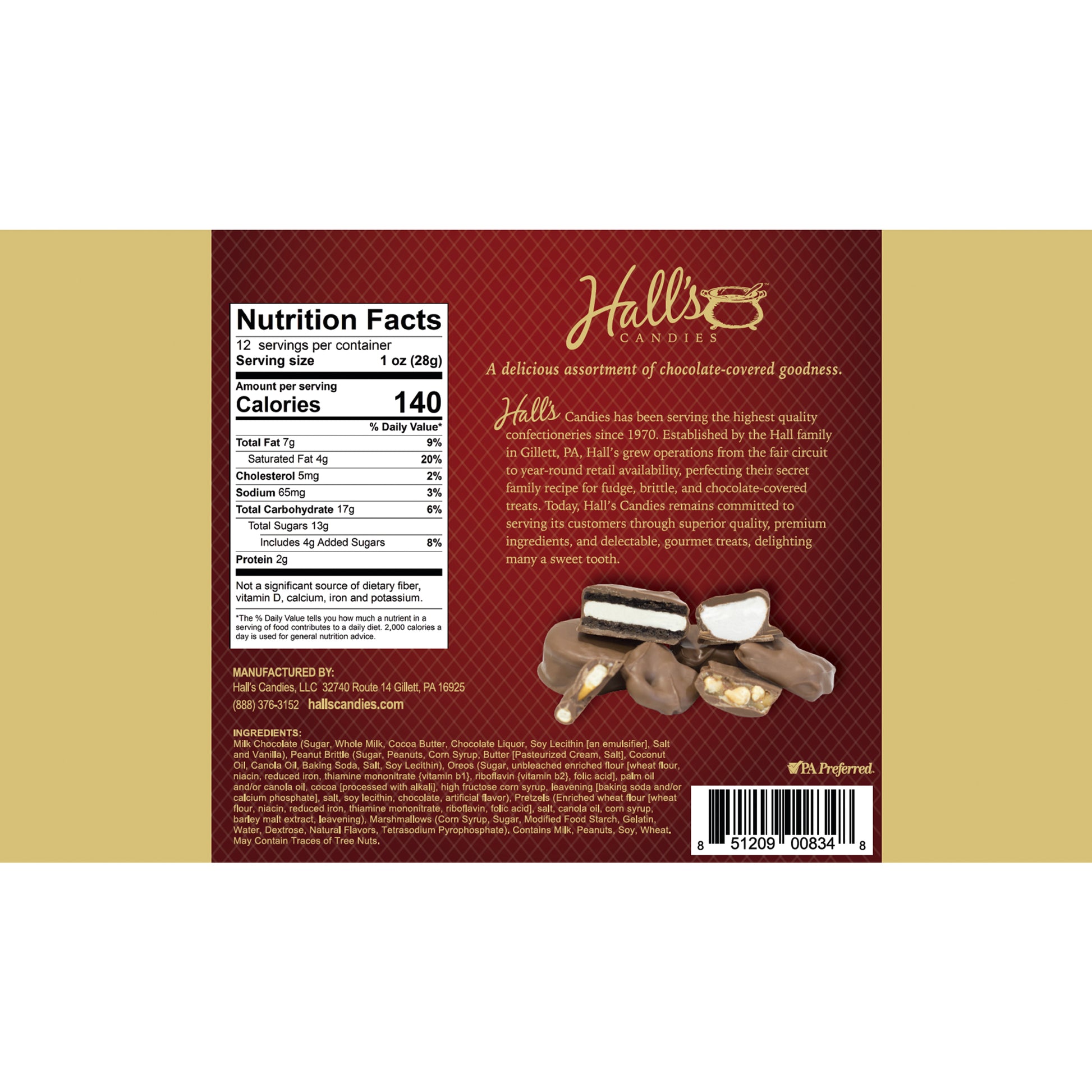 You won't want to miss this! Our 12-ounce assortment of luscious, chocolate-covered treats is rich and delicious. It includes hand-dipped milk chocolate-covered peanut brittle, Oreos, marshmallows, and pretzels.